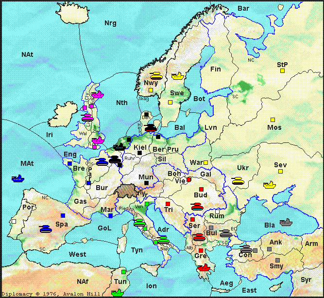 Meanwhile, the game just got very interesting in the east. Austria supports Turkey's attempt to gain Rumania, bouncing the supported Russian fleet move. As a result, Rumania remains neutral for another year, and Turkey gains control of the Black Sea. And because Austria's army moves eastward from Trieste, Italy's self-bounce in Venice proves unnecessary.