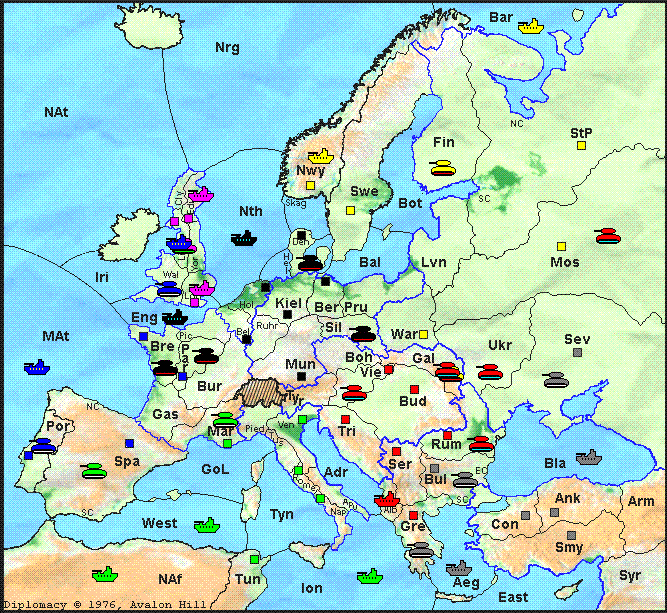 Germany and Italy both move in force against France, while France seeks to stem his losses by picking off Liverpool. Germany sails to the English Channel, but inconsistent orders leave his army stuck in Denmark. Austria marches into Moscow, but sees Turkey's armies move westward to occupy Greece. Turkey's Black Sea fleet also trips up, as it's ordered to convoy an army that moves elsewhere.