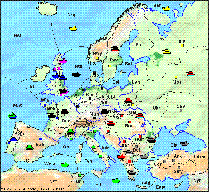 We welcome back our Tsar, just in time for him to watch his centers falling into his rivals' control. Germany marches unopposed into Sweden, while Austria picks off Warsaw.