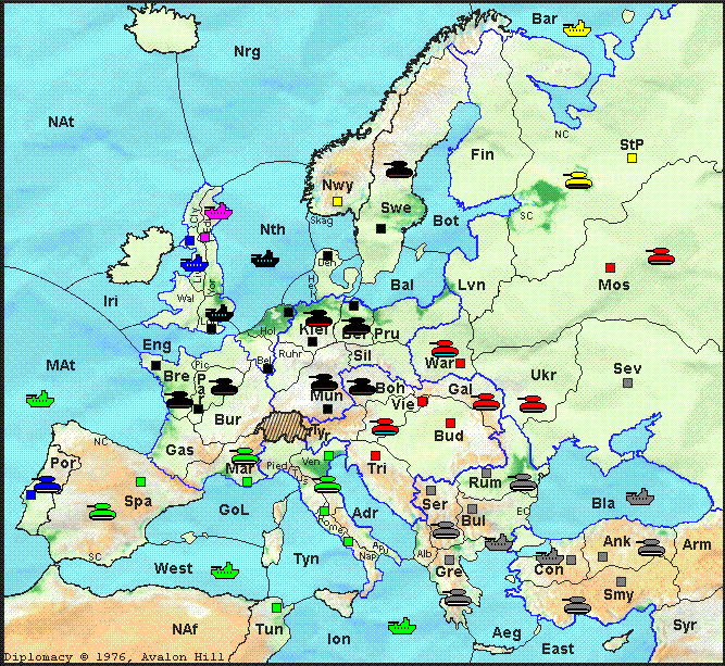 Austria "retreats" northeastward to Ukraine and scuttles his fleet. Germany raises 3 armies, and banks a build for next year if he can hang on to the extra center. Italy raises an army in Venice. Turkey builds 2 armies and a fleet. England, France, and Russia all fail to submit orders, so their respective dislodged units are removed, and tournament rules are applied to remove France's army in Yorkshire rather than the fleet in supply center Liverpool.