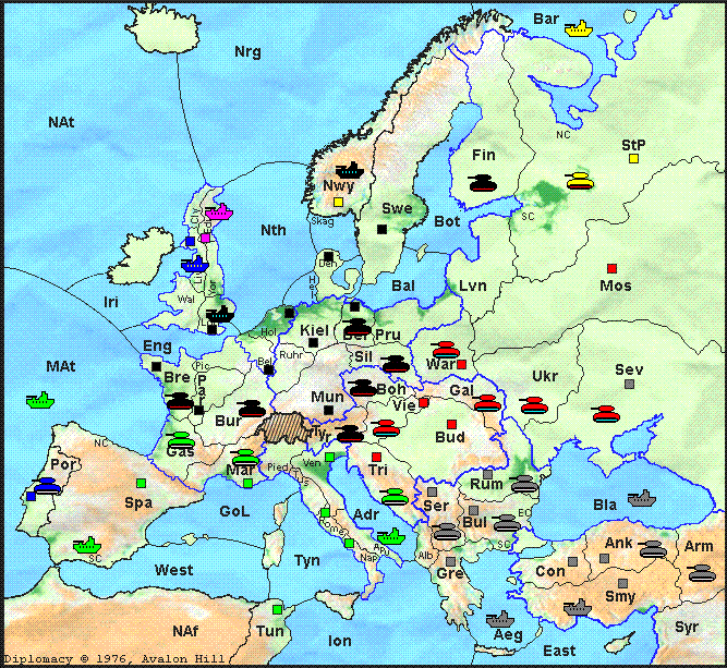 Germany and Italy bounce each other in the English Channel, while Italy moves to Gascony. Germany takes advantage of the Russian NMR to sail unopposed into Norway. Austria reoccupies Sevastopol, while Turkey moves an army to Armenia. Austria and Turkey bounce each other in Budapest, which also stymies Turkey's attempted convoy to Rumania. Italy marches unopposed into Trieste, while Germany advances into Tyrolia.