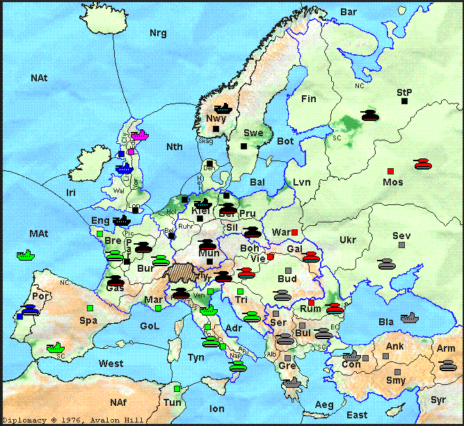 Italy raises two new armies, while Germany builds an army and a fleet. Austria vacates the Ukraine.