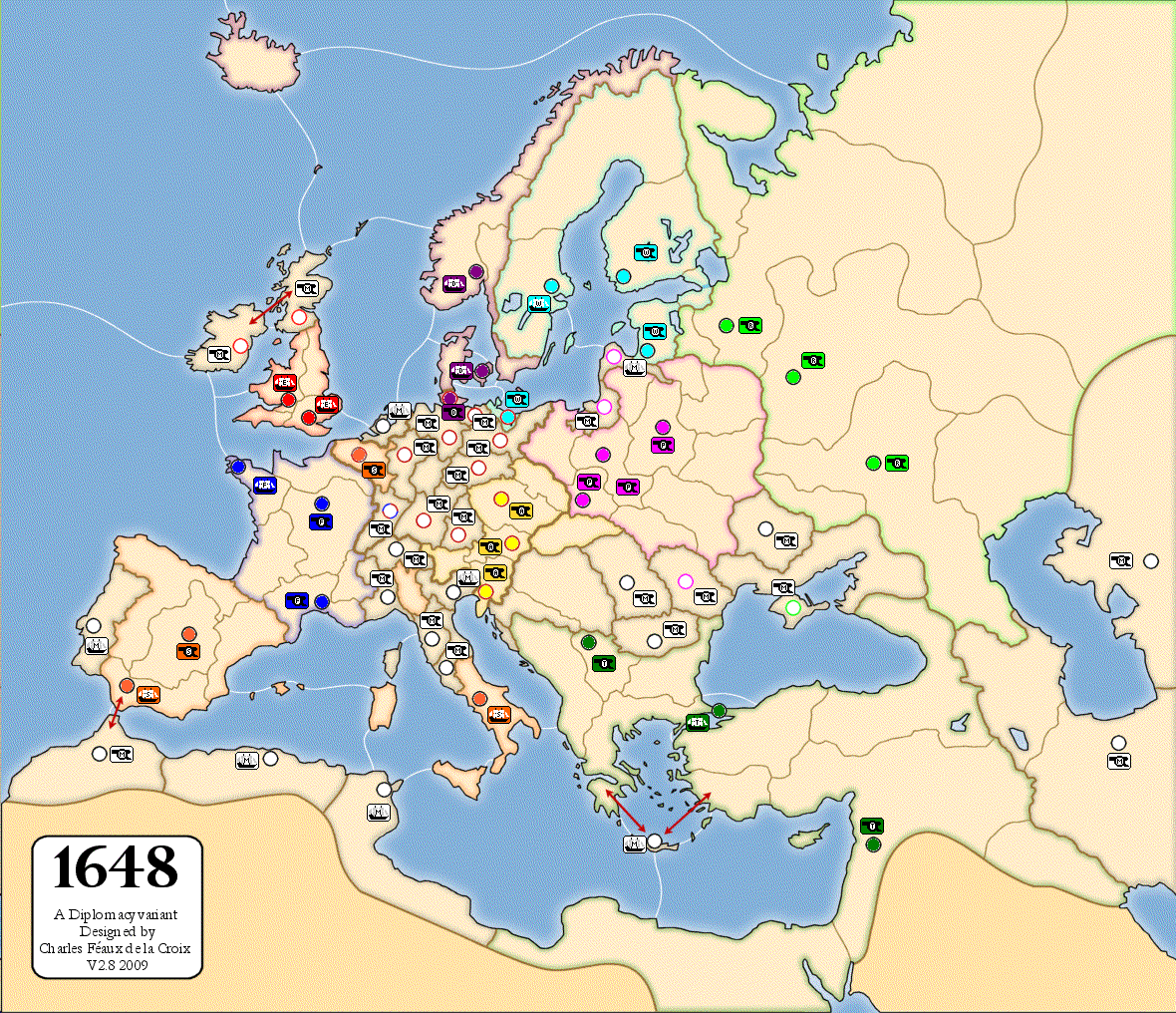 I like to think our player roster is a healthy mix of 1648 "veterans" and "new blood". Dirk, Mikael and the past game's winner, Jorge, all played right from the outset of that game, while Harvey joined as a replacement towards its end. If you're interested in their past exploits and wish to learn how that first playtest went, check out DC264's game page and message board over at www.diplomaticcorp.com. Note, however, that the present map (3.0) differs on five counts from that previous version.