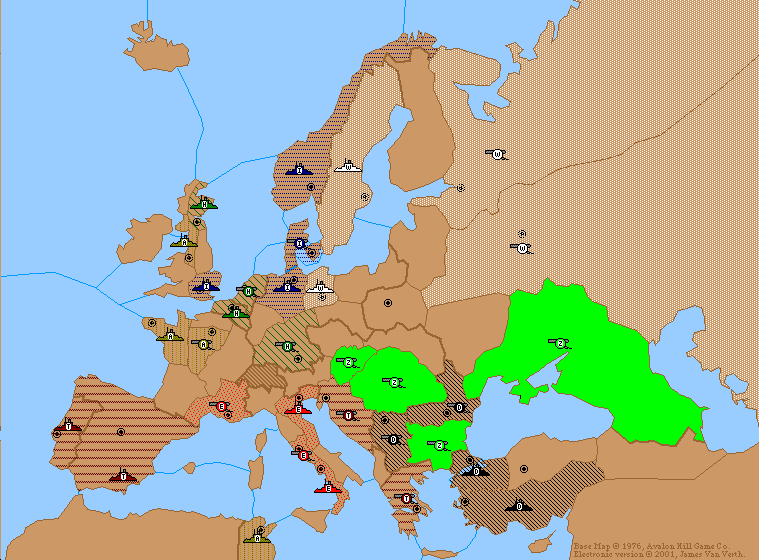 We have thirty-two units: 16 armies, 16 navies. The distribution is mostly what you’d expect. England is full of fleets. The Balkans are full of armies. There are a few surprises (to my eyeses): A Denmark, A Greece, F Venice. But I’m sure you know what you’re doing. If not, you’ll be dead soon anyway.