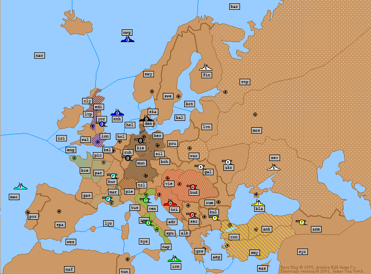 I do need to point out how I handled one issue. Russia ordered st. pete to both Finland and Black sea. Clearly he intended Sevastapol to Black and St pete to Fin. But since the order is wrong, I chose to void out the St. pete to Black altogether. Since St pete - finland was the only valid order for st pete, I let that one stand. Hope that makes sense.