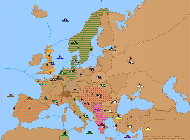 Balkans lent Austria a hand, but forces in Tri and Gre didnt get the memo... which barely saves Spain from dropping to last place. Russians trade Bud for War, and a plague in Saint Petersburg sees everyone scatter from the region. Lowlands give off a sigh of relief that they wont be forced to live in France, Norwegians turn their focus north, France liberates their Med port, and Italians continue their search for Dracula.