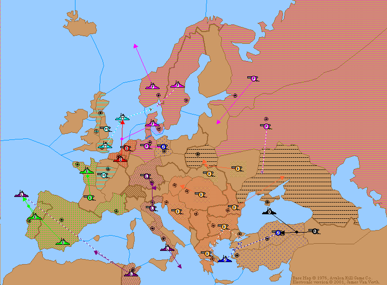 The other region of interest -- and it's an entire region -- is the open waters of the North and West. Paz Eterna drives the Lemurs out of the Mid-Atlantic; Rosstopia drives Mos Eisley out of the North Sea; FourGotten pushes into the Norwegian Sea... and yet things aren't so bad for the losers... Lemuria gains the chance to 'retreat forward' into English waters, while Mos Eisley gains the opportunity to retreat into vacated Norway or fall back to Edinburgh (or, gulp, to risk a bounce in the English Channel). The regions is a bit of a mess. Cassandra peers into her crystal ball and divines, "This might be a propitious time to swap allies."