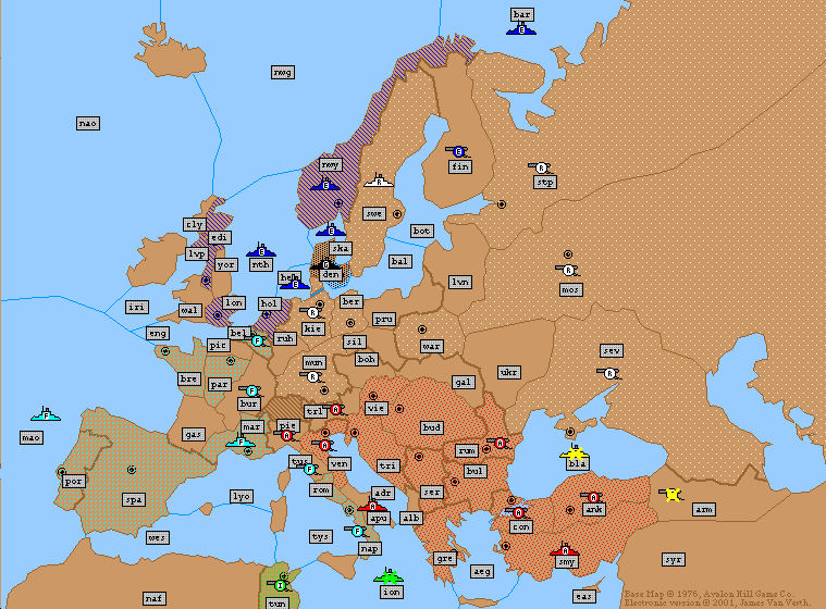 England (James) has NMR. This is James's first NMR for this game. If James fails to submit moves at Spring 1905 then unfortunately England will join those in CD. However i am hopeful that James will be back with us. And it would not be fitting for me to pass up a mention of Turkey falling to Austria at this particular time of year.