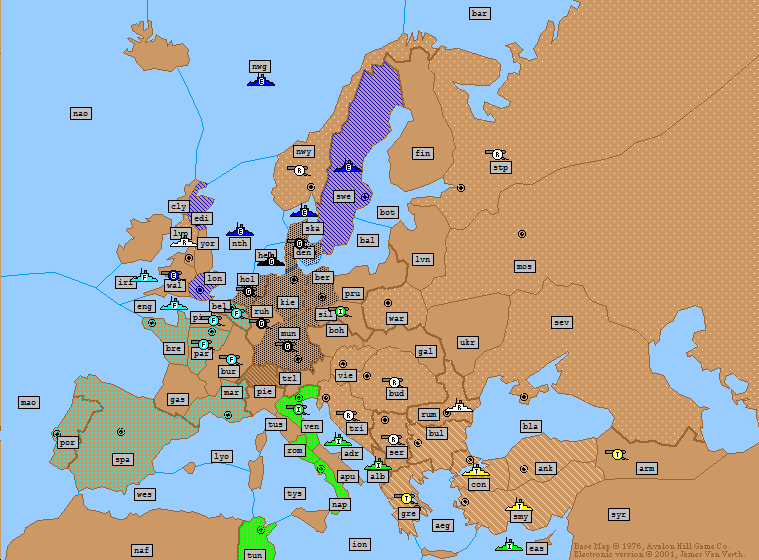 France and Germany are still locked in a stalemate along their border. Italy and more so England had to give up terrain to the Russians.