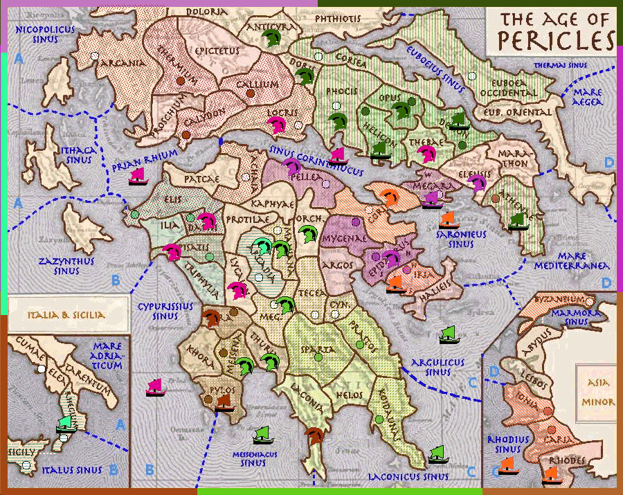 On other fronts, the Atticans are stuck in the mud for yet another turn, the Laconians make more progress against Messenia, and the little Italians via no moves at all survive yet another year! Cumae to remain neutral for five years!