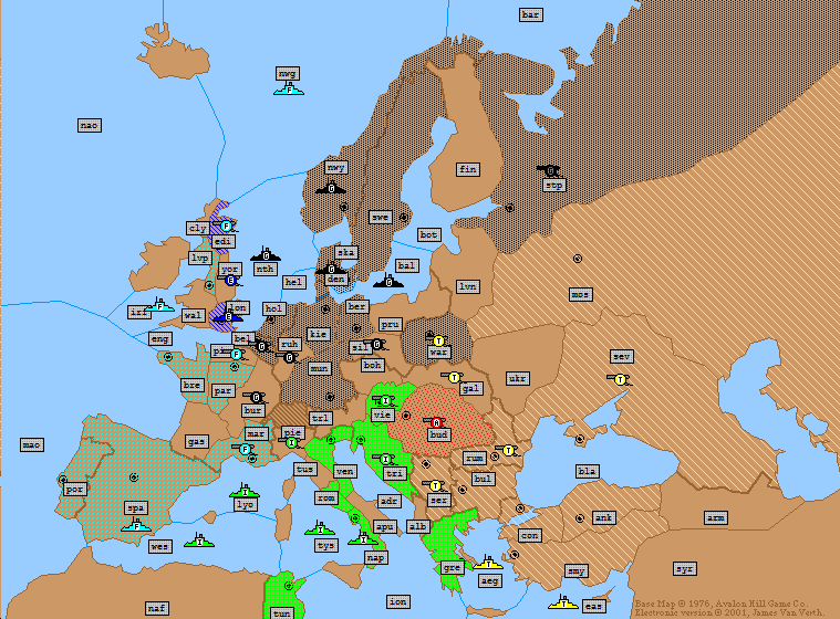 The draw failed, which probably won't suprise most of you given the existence or Austria and England (who NMRed again, suprise suprise!). Assuming neither of them returns from whereever they have gone (the hospital, the grave, UFO's, etc...) next turn, then next turn will make the fourth consecutive NMR on major seasons. So one would have to wait until at least winter to pass a draw assuming continued absence of those players. Of course, that doesn't mean that all the current players necessarily voted in favor of the draw either.