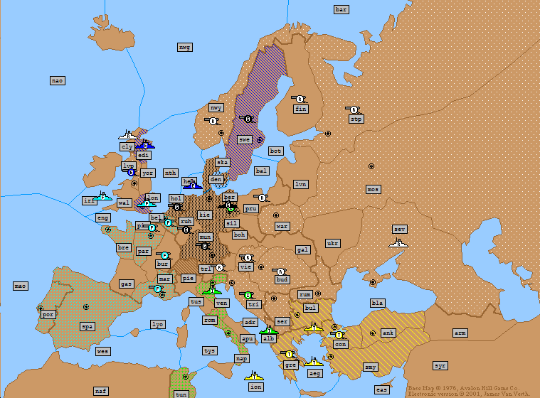 Fall 1905: The Russian leader has not ordered its units so these stay where they are, while trying to figure out what happened to their leader after such a successful campaign in 1904. The damage however is minimal as no Power has attempted to attack Russian units and the only two that tried to pry away Serbia from the Russians bounced ending up empty-handed.