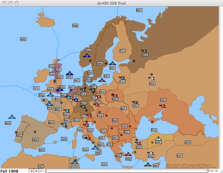 The Russian Question? Was Russia in the Austrian pocket from fall 1901 onwards? As there was little communication with Mike and very convenient A/R stand off moves I began to think so. Then there was the fleet move to Rum when an Army could have been placed there, followed by Rum gift to AH. So 3/1 on T; it is surprising I made it to 1908.